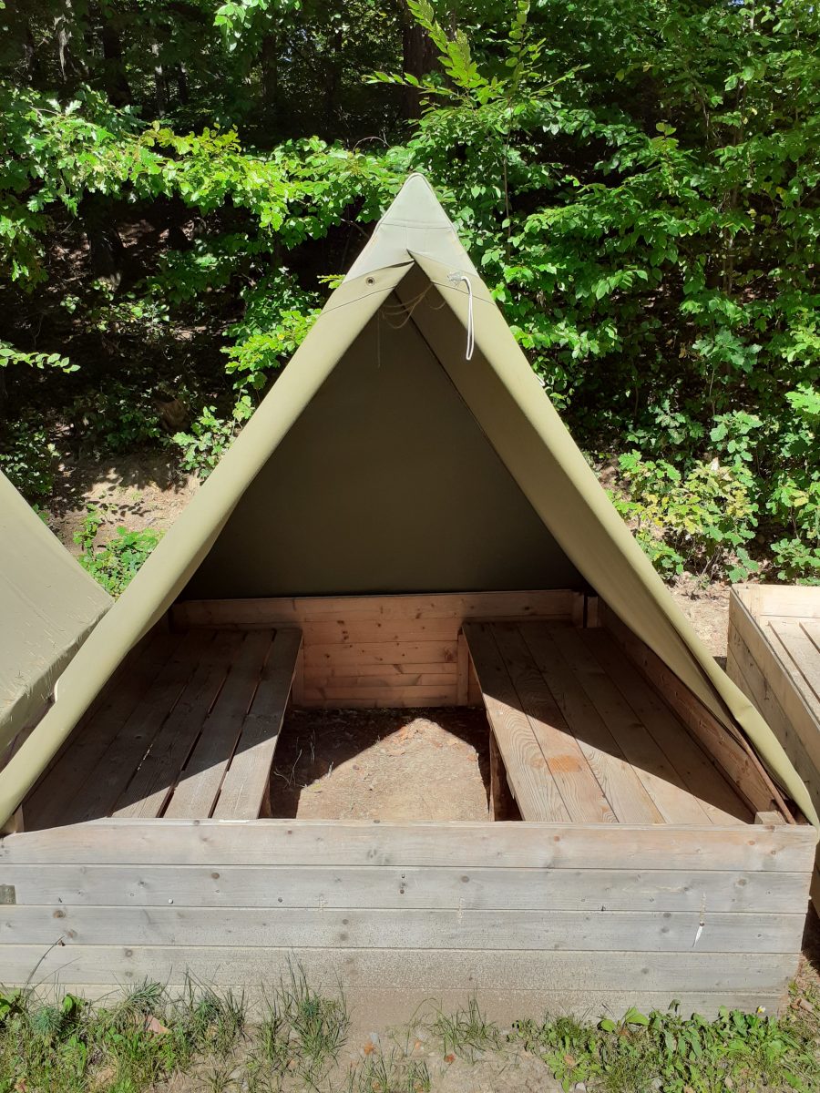 Táborisko disponuje stanmi s drevenou základňou (tzv. podsada) v počte 24. Na dolnom táborisku býva postavených zvyčajne 14 týchto stanov, na hornom 10, je však možné to usporiadať podľa aktuálnych potrieb. Na hornom táborisku sa nachádzajú dva stany Tee-Pee. Vo vybavení táboriska máme aj tzv. hangár, veľký stan o rozmeroch cca 10 x 5 m.